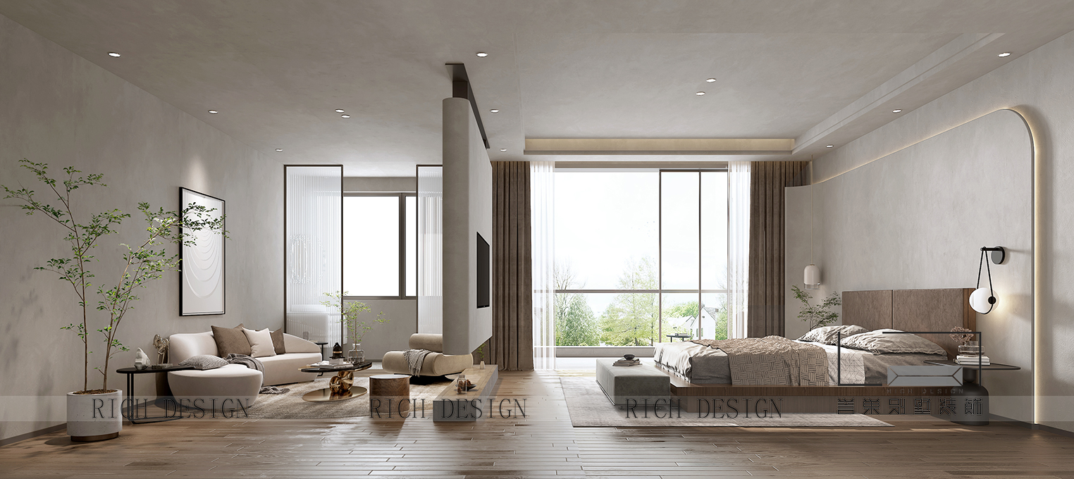 以光為引,納景為畫,融現代簡約與東方禪意,打造可游可居的詩意棲所。天然木石肌理與弧形家具相映,在留白中勾勒溫暖;通透界面消弭內外界限,讓庭院綠意、流水聲與室內琴聲、書香自由對話。最終在光影流動間,成就一座會呼吸的生活劇場。